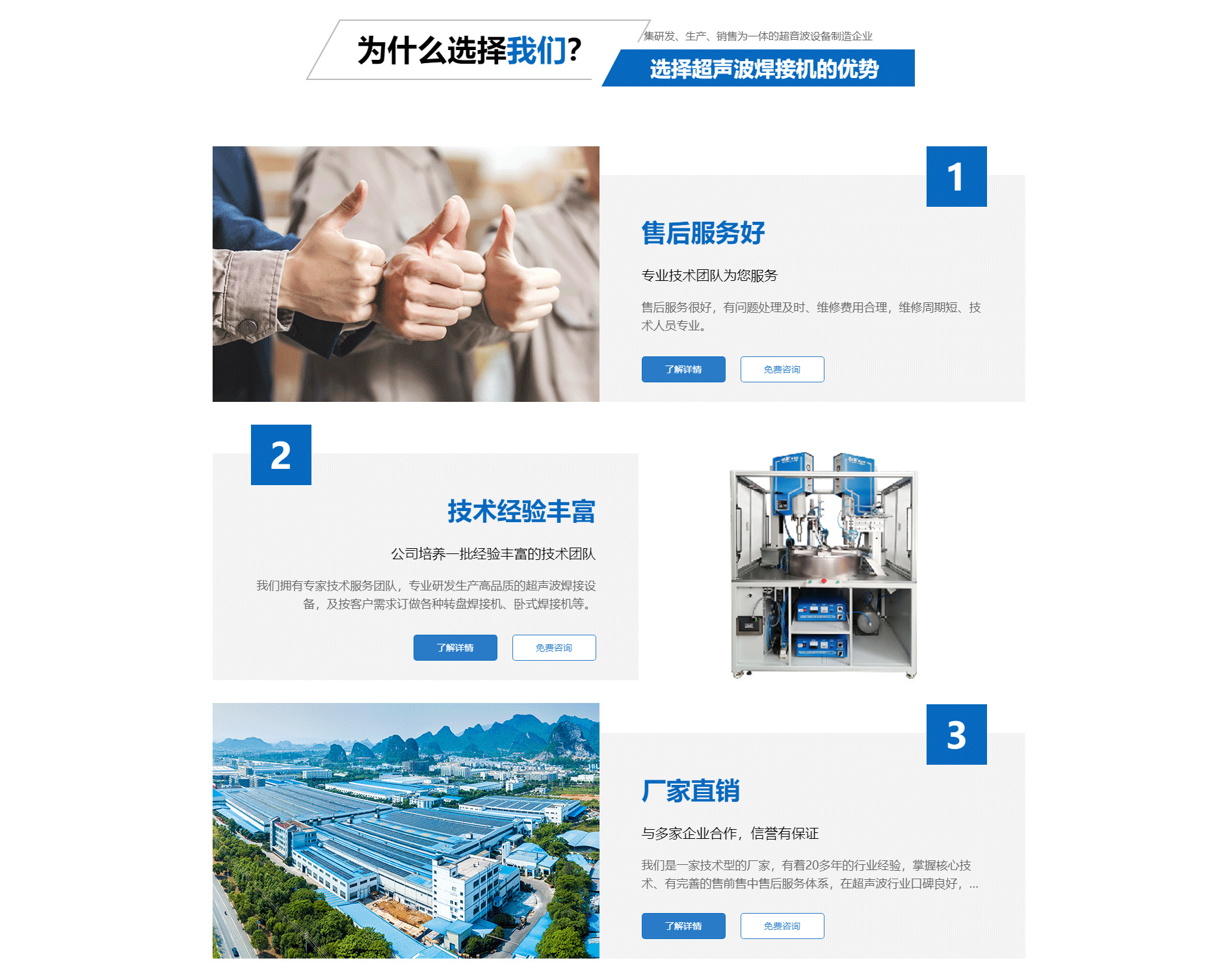 關(guān)于我們廈門勁榮機(jī)械設(shè)備有限公司是一家集研發(fā)、生產(chǎn)、銷售為一體的超音波設(shè)備制造企業(yè),主要產(chǎn)品包括多規(guī)格型號的超音波塑膠熔接機(jī)、熱板式塑料焊接機(jī)、多工位轉(zhuǎn)盤焊接機(jī)、振動摩擦焊接機(jī)、旋轉(zhuǎn)式塑膠熔接機(jī)及配套的工裝夾具等。公司自2003年成立以來,一直致力于產(chǎn)品不斷完善中,并追求產(chǎn)品的精益求精,于2004年向國家商標(biāo)局注冊了“勁榮”牌商標(biāo),2009年榮獲廈門市商標(biāo)。 經(jīng)過多年的努力,公司已經(jīng)發(fā)展成為占地面積2000余平方米、擁有員工50余人的企業(yè)。公司一直將“品質(zhì)是企業(yè)發(fā)展的原動力”作為經(jīng)營理念,嚴(yán)把質(zhì)量關(guān),建立了一整套有效的安全生產(chǎn)及管理模式,不僅贏得了同行的認(rèn)可,更取得了客戶的信賴,先后與九牧集團(tuán)、路達(dá)工業(yè)、建霖集團(tuán)、西伯電子、蒙發(fā)利實(shí)業(yè)、松霖科技、銥科集團(tuán)、科司特電子等公司建立了長期的合作關(guān)系。 面對已經(jīng)取得的成績,我們不驕不滿,因?yàn)樯钪獦I(yè)績只能代表過去,只有靠良好的產(chǎn)品質(zhì)量和完善的售后服務(wù)才能在客戶中口碑相傳,在...